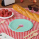 Happy birthday party plates featuring an ice cream cone topped with a birthday candle on a turquoise background.