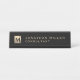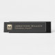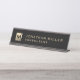Elevate your workspace with this stunning black and gold desk name plate featuring a square brushed metal monogram emblem and custom text in elegant golden font on a sleek black background. Perfect for professionals who want to make a lasting impression, this name plate is a sophisticated addition to any desk or office.