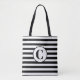A custom tote bag that has a black and white striped pattern. In the centre, there is a monogram logo that can be personalised with your initial. This product makes a great gift for any occasion.