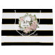 Modern design, bold black and white wide striped pattern with small faux gold glitter edging and a hand painted floral wreath made of white and blush pink roses with vining branches and pink and white hydrangeas. A few lavender Freesias are also tucked in along with succulent leaf foliage clusters. A typography text message reads "So Happy for you two!" and the bride and groom's names are personalised below. Art copyright Audrey Jeanne Roberts all rights reserved.
