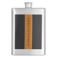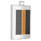 Classic masculine flask with two thin white stripes and a wide vertical orange stripe on the centre with custom name on it.