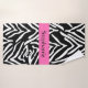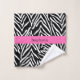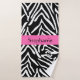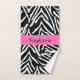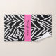 Personalised black and white zebra print towel set. The design features a black and white zebra pattern and a hot pink band in the middle with your custom name.