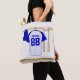 Personalised blue and white baseball jersey hanging in a sports locker room with a baseball cap, baseball bats and ball which is fully customisable with your own name and number. Great gift for any baseball, t-ball or softball player or fan.