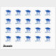 Masculine blue and white graduation sticker begins with a graduation cap or mortar board in two shades of deep blue. Class of and the graduation year is written below in a bold, blue athletic inspired font. The same font is used in the graduate's last name, but a large script font is used for his first name to give the graduation sticker personality. Use this blue and white graduation sticker to seal graduation announcements and graduation party invitations.