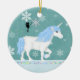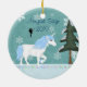 ~Cute blue and white unicorn and fairy holiday Christmas tree ornament. They are walking through a magical winter forest with falling snowflakes. Personalise with a name and year.