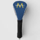 Personalised Name and Initial Letter custom printed on a Golf Club Driver Cover with a Monogram in a modern classic sans serif font in navy blue and maize gold or yellow to match your favourite colours, or favourite sports team or university college or school colours. Custom Driver Covers are great gifts for dads, grads, grandpas, husbands, and groomsmen.