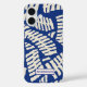 Blue leaf illustration personalised iPhone case. Leaf pattern on a blue background with text name field at bottom centre.