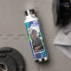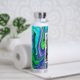 Digital fluid art in blue, white and lime green water or coffee bottle. Personalise it by adding your photo and name to it.