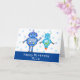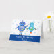 A fun and colourful happy birthday card. The design features two cute and friendly robots in coordinating shades of blue. A waving robot and its flying buddy are surrounded by gear-shaped confetti. The front of the card is personalised with the recipient's name. The inside of the card features a bold gear pattern and there is also a blank space for your own message.