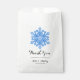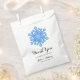 Custom winter themed wedding favour bags. This design features a blue faux glitter snowflake and elegant script font. Easily personalise with the bride and groom names for unique favour gifts for your guests.