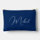 Create your own custom, personalised, beautiful modern elegant white script / typography monogram monogrammed, durable Spun Polyester, mens womens dark navy blue zippered cosmetic makeup toiletry bag golf beach accessory pouch. Simply type in your name / initials / monogram, to customise. Make a great gift for birthday, fathers day, mothers day, christmas, holidays, new years, wedding, marriage anniversary, and more, for your loved ones, mum, dad, husband, wife, bride, groom, bridesmaid, groomsmen, son, daughter, sister, brother, grandpa, grandma, grandparents, grandkids, kids, family and friends.