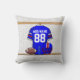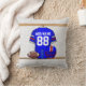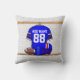 A personalised American football grid iron jersey in blue with white and red stripes, hanging in a sports changing room with a football helmet, a water bottle and a football. The jersey can be fully personalised with the number and name of your choice to make a great gift for any football fan, grid iron player or football coach.