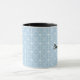 This elegantly patterned mug is light blue with a geometric tiled pattern of lines and curves, giving an impression of flowers on a trellis. Personalise with the recipient's name for a stylish individual gift.
