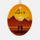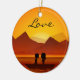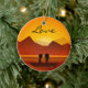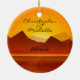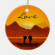 Personalised Cute Cartoon Silhouette Couple Boating LOVE Christmas Ornament. Features a Mountain and Sunset Background.