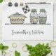 A modern bohemian inspired kitchen towel with a hand-drawn kitchen shelf illustration, perfect for boho chic farmhouse living. Designed in a pastel yellow, grey, and green colour palette, this unique home decor accessory will be a stunning accent piece for the kitchen and dining room and make a beautiful gift for her who loves cooking.