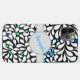 Flowers and swirling white petals against a bold black background. Original digital painting. Crisp edges, sharp lines and white dots and swirling petals. Blue teal colour fade ombre flower centres. Personalise with a name.