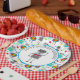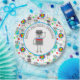 Robot themed personalised birthday party paper plates. Colours: blue, yellow, lime green and red.