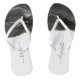 A black watercolor agate design trimmed with gold faux glitter decorates the front portion of these flip flops. Personalise them with elegant charcoal grey handwriting script on a white background for the bride or any other member of the wedding party. Ideal for a bachelorette party, bridal shower or beach wedding.
