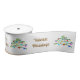 The artwork is of a festive and colourful drawing of a green Christmas tree trimmed with colourful ornaments along with the phrases "Merry Christmas," "Yuletide Blessings!" "Happy Holidays!" and "Season's Greetings!" presented in warm brown colour. The phrases are customisable should you wish to personalise your message on this elegant Christmas ribbon. It makes a fun and festive addition to your holiday gifting and decor.