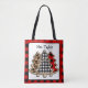 Red, black and white chequered flannel pattern Christmas trees with bow tote bag. Add a name in the personalise area. Cute gift for teachers.