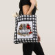Red, black and white chequered flannel pattern Christmas trees with bow tote bag. Add a name in the personalise area. Cute gift for teachers.