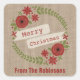 A Christmas sticker featuring an illustration of a red and green floral wreath accented with holly. Banner over wreath says, "Merry Christmas." Background is burlap inspired. Personalise with your family's name at bottom.