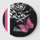 Striking black, white and cranberry pink design featuring an pink butterfly against a black background with pretty white floral swirls. There is a pink and white stripe to the side of the design to add an extra bit of colour against the black background. Customisable text is included to add the name of the butterfly lover.