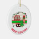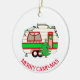 Cute vintage red and green retro RV camper camping themed Christmas ornament. Hand drawn cute personalised holiday ornament.
