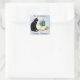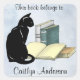 Personalised Cat and Books Bookplate Sticker against a light blue watercolor background, with customisable text.