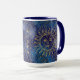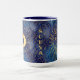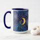 Pour a good brew and enjoy this celestial mug with your name or as a gift to someone. This beautiful mug holds 15 ounces, features blue and gold botanical space background, golden leaves pattern, sun and moon on both sides, custom name or initials vertically in the centre of the mug, and a blue interior with matching handle... for an enchanting way to start and end the day!