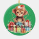 This is a personalised collectable Christmas ornament to commemorate a child's second Christmas. It has an optional red velvet pouch for safe keeping or gift giving. It is ceramic and it features an adorable monkey on each side. One side has a red background while the other side has a green background. Both sides are personalised.