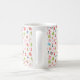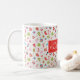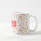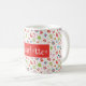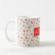 A cute Christmas mug that can be personalised with a person's name or monogram initials. This design featuring gifts, stockings, candy-canes, snowflakes, ornaments and bells in traditional Christmas colours.