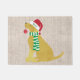 Personalised Festive Christmas Golden Retriever Holiday Dog dressed in santa hat and green and white scarf holding red polka dot christmas ornament in its mouth. Natural Burlap Background. Cute christmas gift idea for golden lovers and dog lovers! The Preppy Dog™ designs © 2015 - 2019 EMR Designs.