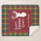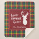 Cute home sweet home Christmas movie watching blanket you can easily customise by clicking the "Personalise" button, Featuring and deer silhouette and clan Buchanan tartan in green, yellow, and red check.