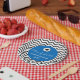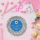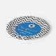 This graduation party plate features black zigzags as the background and a blue circle in the centre. Popular hand lettered style text reads: Class of 2025 with custom text for the graduate's name and school. This paper plate is accented with a graduation hat above the text. The blue circle colour can be changed to any available colour by choosing the customise it button.