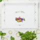 Design features a white background to the image of a cluster of colourful fruit as main design. Customisable forest-green text is displayed above in an elegant font. A lovely blue flourish borders the edges. Designed to coordinate with the Colourful Fruit-Themed Kitchen collection. Also available in blue.