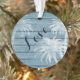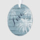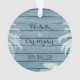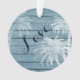 This beach LOVE holiday Christmas ornament design features a palm tree overlay on a faux rustic wooden background in shades of blue and white. It's perfect for a couple's first Christmas together. It can be personalised with names and a date or year. *