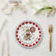 Cowboy 5th Birthday paper plates features a little cowboy dressed in cow print chaps, cowboy hat, and boots, a lasso that leads to a red balloon, silver stars, rope style text that reads I'm 5, grey and white vertical stripe border, and an area you can customise with a name and age, thank you message, or anything you want it to read!