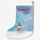 A personalised Christmas stocking with a cute snowman illustration. He is wearing a black stovepipe hat, holding a classic corn cob pipe, and wearing a red scarf. Standing in the cold white snow smiling and waving hello. The background is composed of a watercolor sky with blue and purple colours blending and mingling together. Personalise with a name in festive red.