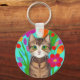 Personalised Cute Grey Cat with Colourful Flowers Key Ring