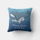 A cute cartoon mother whale embraces her baby calf in the middle of a sparkling blue ocean in this illustration of motherly love. White hearts stream from mama's head. Text beneath the marine animals can be personalised with a family member and child's name. This pillow makes a lovely new baby gift or a beautiful addition to a nautical themed nursery or kid's room.