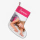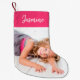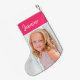Cute custom photo christmas holiday stockings for you and your family featuring a 2 photos of your choice (back and front), and a bright pink background with a personalised name.