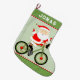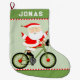Creative cycling themed Christmas stocking featuring Santa biking. Add name of your favourite cyclist, bike racer or mountain biker.