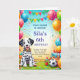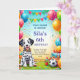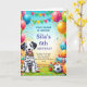 A cheerful and colourful birthday invitation featuring a playful cartoon Dalmatian puppy seated among wrapped presents, a soccer ball, and toys. The background is bright white with festive pastel decorations including balloons, confetti, and a string of triangular pennant flags across the top. The overall aesthetic is light, joyful, and kid-friendly. Text is centred and cleanly laid out in a mix of modern sans-serif and playful script fonts, with placeholders for name, age, date, time, location, and RSVP details.