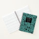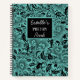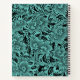 On a blue green teal backdrop are sketched black floral foilage for dramatic flair on this note book cover along with a black square in the middle where you can personalise your notebook.
