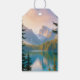 This gift tag features a customisable, scenic mountain lake photo, making it perfect for outdoor-themed or rustic weddings and events. The serene landscape image showcases a misty lake framed by towering mountains and trees, creating a peaceful, nature-inspired feel. Text personalisation includes "Thank you!" followed by the couple's names, the event date, and location details, all in a classic serif font. The muted, pastel colours of the background add a romantic and sophisticated touch, suitable for a variety of occasions. The tag's simple yet elegant design allows it to be a memorable keepsake for guests.