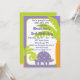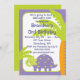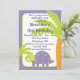 This customisable dinosaur birthday party invite features a dinosaur with hearts on it's back between two palm trees.
