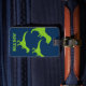 Personalised t rex dinosaur travel luggage tag for kids Custom T Rex dinosaur bag label for kids suitcase. Cute Birthday or Christmas gift idea for boys and girls. Green prehistoric Tyrannosaurus rex animal design with customisable colour background. Personalised wild trex supplies for children. Fun for kindergarten, grammar school, elementary school etc.