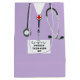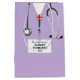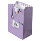 Creative doctor graduation gift bag featuring lavender hospital scrubs and stethoscope art. Edit text to add doctor, physician assistant, or nurse's name.