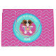 This custom birthday gift bag features Sophie, a brown and white cartoon dog, relaxing on a inflatable pool float in the shape of a doughnut. Sophie is wearing sun glasses and is wearing a pink swimsuit with a pineapple design on it. This gift bag has a wavy pattern and illustrated sparkles as accents. The gift bag has tones of aqua, purple, bright pink, white and mint green.